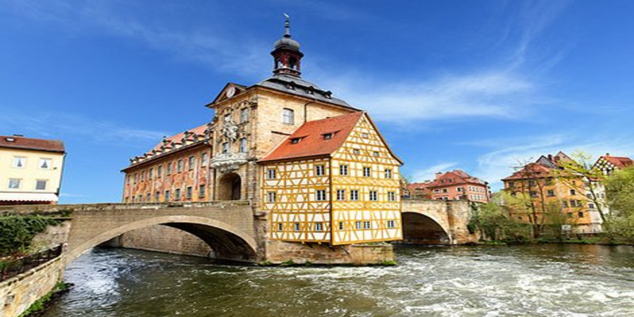 14세기에 바로크양식으로 지어졌던 이 건물은 18세기에 로코코 양식으로 다시 지어진 건축물로 강을 기준으로 한쪽은 일반시민, 강건너 주교구는 특권층이 나눠살았다고해요. 양측모두 시청사 위치를 탐냈어서 그를 해결하기위해 강 정가운데에 건물이 위치하게 되었답니다. 벽 전체에 입체감을 준 그림이 그려져있고, 화려합니다. 제2차세계대전의 폭격을 피한 도시라서 옛 건축물이 그대로 자리잡아 고풍스럽고, 옛스러움이 물씬 느껴지고, 오늘날 밤베르크의 랜드마트라고 할수있겠습니다